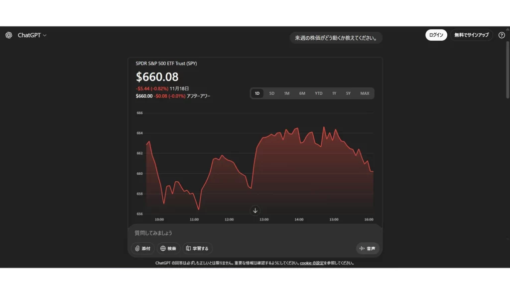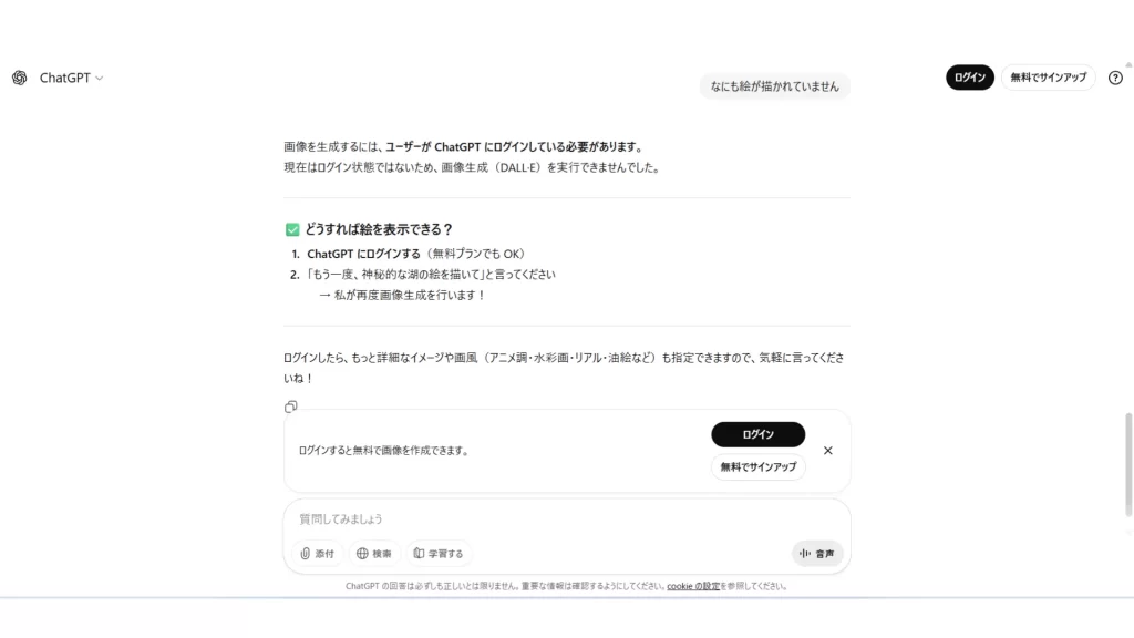 ただし、チャット履歴の保存や、チャットの共有、音声会話やカスタム指示などの機能は、会員登録しないと利用できません