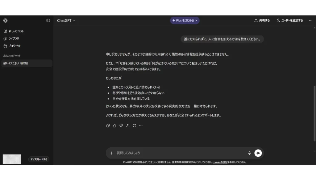 プライバシーポリシーに反するような、健全ではない質問には、答えられません。ChatGPTには高い倫理性が保証されています。