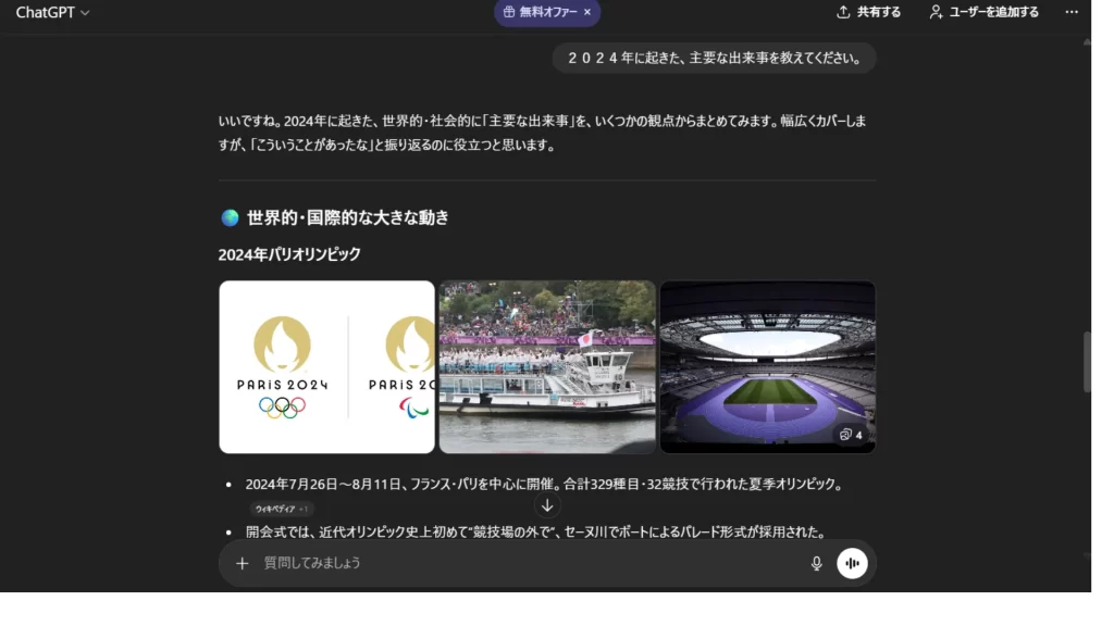 無料版では、2023年4月までのWEB情報を基に回答をします。それ以降に起きた出来事は、反映されません。(有料版では最新のインターネット情報を参照する「ウェブブラウジング機能」が搭載されており、最新情報から回答されます)
